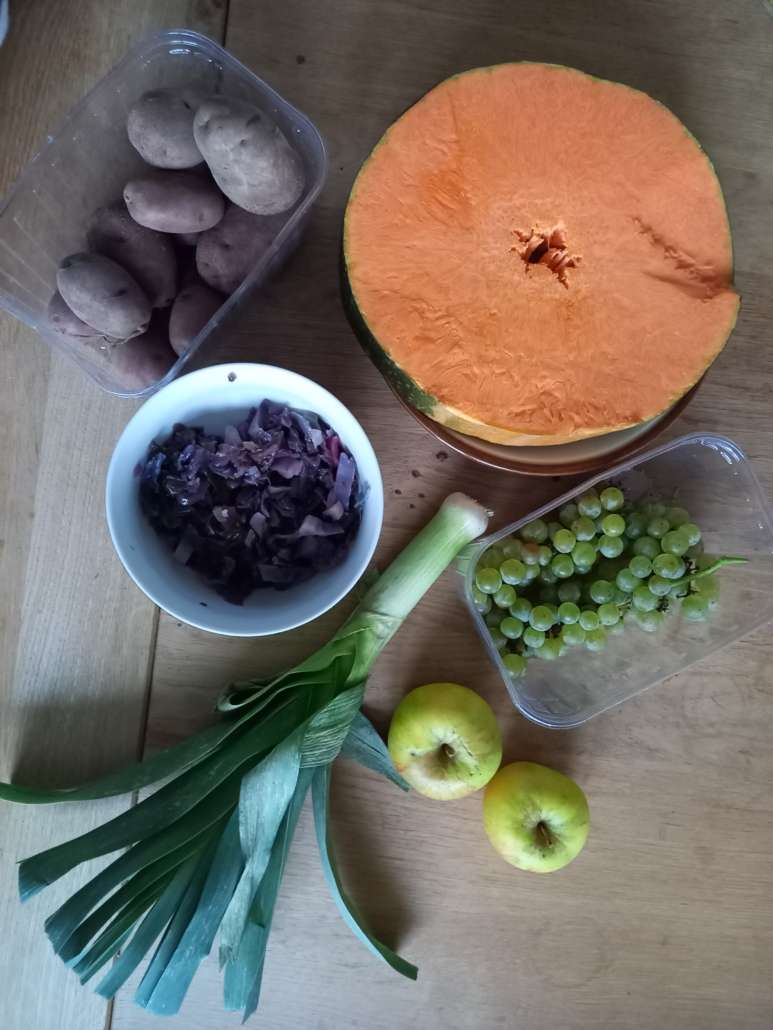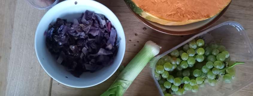 Unsere Gemüse- und Obstfrau im 14. Wiener Bezirk versorgt uns regelmäßig mit frischen Produkten entsprechend der Jahreszeit. Jetzt sind es gerade Kürbis, Lauch, Kartoffeln, Äpfel, Weintrauben, Rotkraut. Sie tragen den vollen Geschmack in sich und nähren uns durch ihre Energie, auf yogisch ausgedrückt: durch ihr Prana.